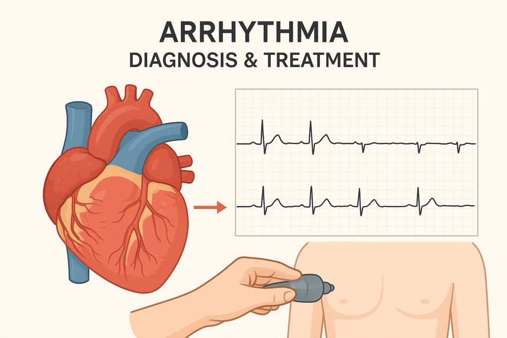 Arrhythmia refers to an irregular heartbeat — it may be too fast, too slow, or erratic. These rhythm disturbances occur when the electrical signals that coordinate the heartbeat don’t function properly. Early diagnosis and treatment are crucial to prevent complications such as fainting, stroke, or heart failure.